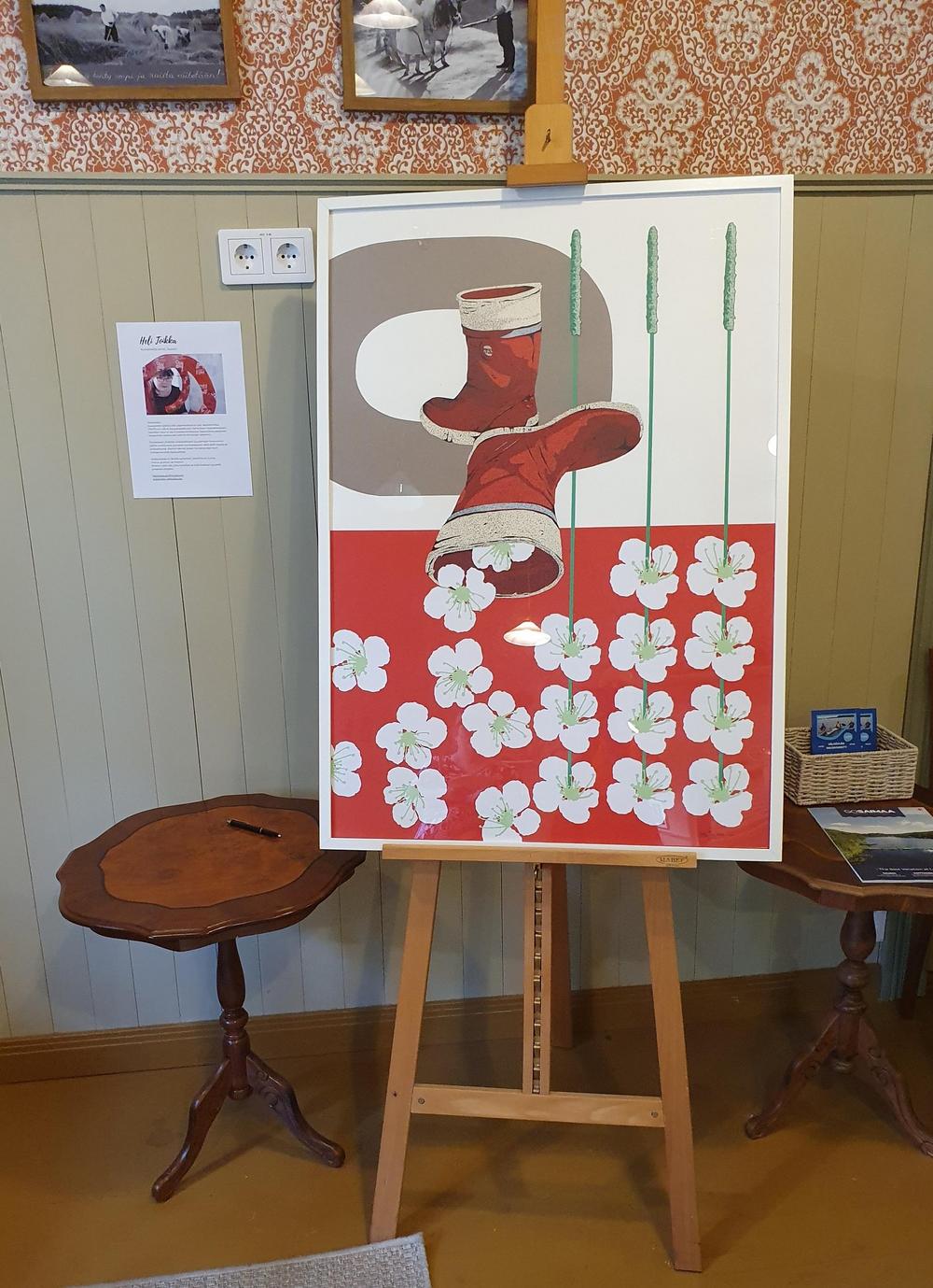 "Näyttelyn teos on osa 3-osaista kevätsarjaa: Vapauttakaa peipposet,Saappaiden salaisuudet sekä Se kimalaisen keltainen.Teoksessani yhdistän mielipaikkaani puutarhaan haravoinninjäljiltä unohtuneet punaiset kumisaappaani sekä siellä leijailevat kirsikankukat. Poimin hennot kukat heinänkorteen kuinmetsämansikat Tärkeintä on tunne, minun ja sinun, se motivoi.”