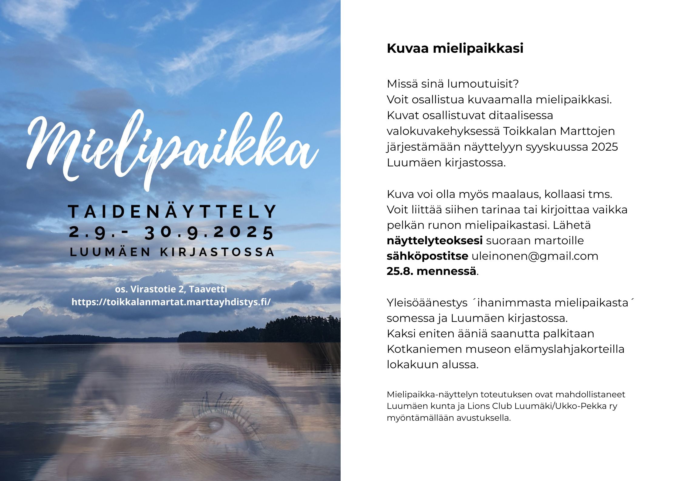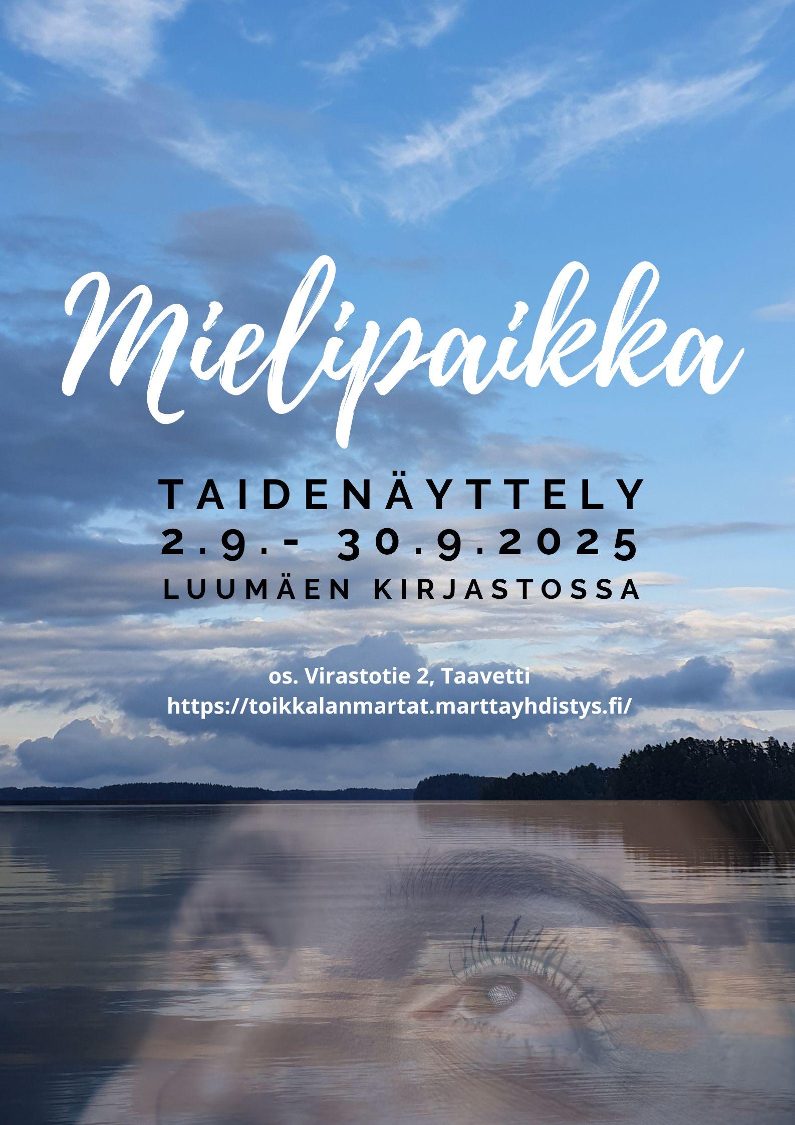 kaikille näyttelyyn osallistuneille taiteilijoille, Kotkaniemi-museolle, Luumäen kirjastolle ja Mielipaikka-näyttelykokonaisuuden mahdollistaneille Luumäen kunnalle ja Lions Club Luumäki/Ukko-Pekka ry:lle sekä Toikkalan Marttojen aktiiveille (9.10.2025, UL)